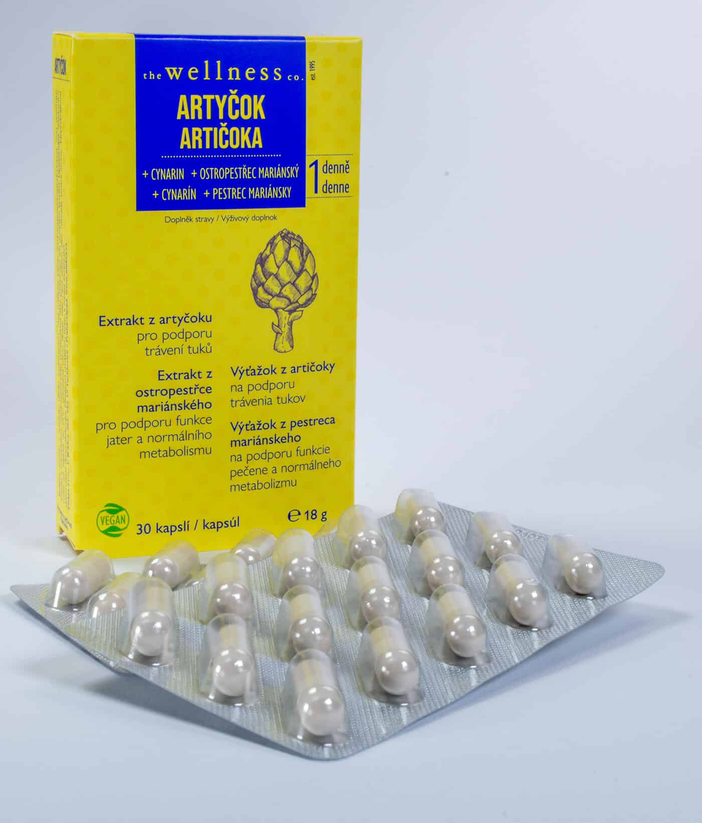 Zloženie: Extrakt z artičoky (80 %), maltodextrín, rastlinný obal kapsule (hydroxypropylmetylcelulóza, farbivo (oxid titaničitý)), extrakt z pestreca mariánskeho (3%), protihrudkové činidlá (horečnaté soli mastných kyselín)