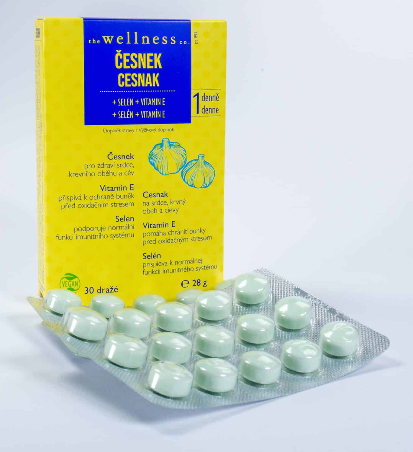 Zloženie: Výťažok z cesnaku* s min. 3,25 % alliinu (50 %), poťah dražé (sacharóza, talok, arabská guma, škrob, farbivo (meďnaté komplexy chlorofylov)), protihrudkové činidlá (celulóza, horečnaté soli mastnách kyselín), stabilizátor (polyvinylpyrrolidon), tokoferyl-sukcinát, selénan sodný.